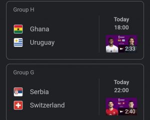 ການແຂ່ງຂັນເຕະບານໂລກທີ່ກາຕາ~ຊິງກັນເຂົ້າຮອບສອງ ~ ສາຍH &G ~ ໔ຄູ່ສຸດທ້າຍຂອງການແຂ່ງຊັນຊີງກັນເຂົາໄປຮອບສອງ ໃນມື້ນີ້ ວັນສຸກ ວັນທີ ໒ ທັນວາ ໒໐໒໒ : ສາຍ H :ເກົາຫຼີໄຕ້ ພົບ ປອກຕຸເກດ ~ ເວລາ ໑໖ໂມງການາ ພົບ ອຸຣຸກວຍ ~ ເວລາ