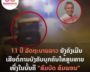 ສົມບັດ ສົມພອນ ຫາຍໄປໄສ? #SombathSomphone 15 ທັນວາ 2023 ໃນວັນຄົບຮອບ 11 ປີ “ສົມບັດ ສົມພອນ” ຜູ້ນຳພາກປະຊາສັງຄົມຂອງລາວໄດ້ຖືກລັກພາຕົວໃນວັນທີ 15 ທັນວາ 2012 ແລະ ຈົນເຖິງປະຈຸບັນກໍຍັງບໍ່ຮູ້ຊະຕາກຳຂອງລາວ. ພວກເຮົາເຊິ່ງເປັນອົງກອນດ້ານສິດທິມະນຸດ ແລະ ບຸກຄົນພາກປະຊາສັງຄົມ ຂໍປະນາມລັດຖະບານລາວທີ່ສ້າງຄວາມລົ້ມເຫລວຢ່າງຕໍ່ເນື່ອງ ທີ່ບໍ່ສາມາດໃຫ້ຂໍ້ມູນທີ່ຢູ່ ແລະ ຊະຕາກຳຂອງ ສົມບັດ