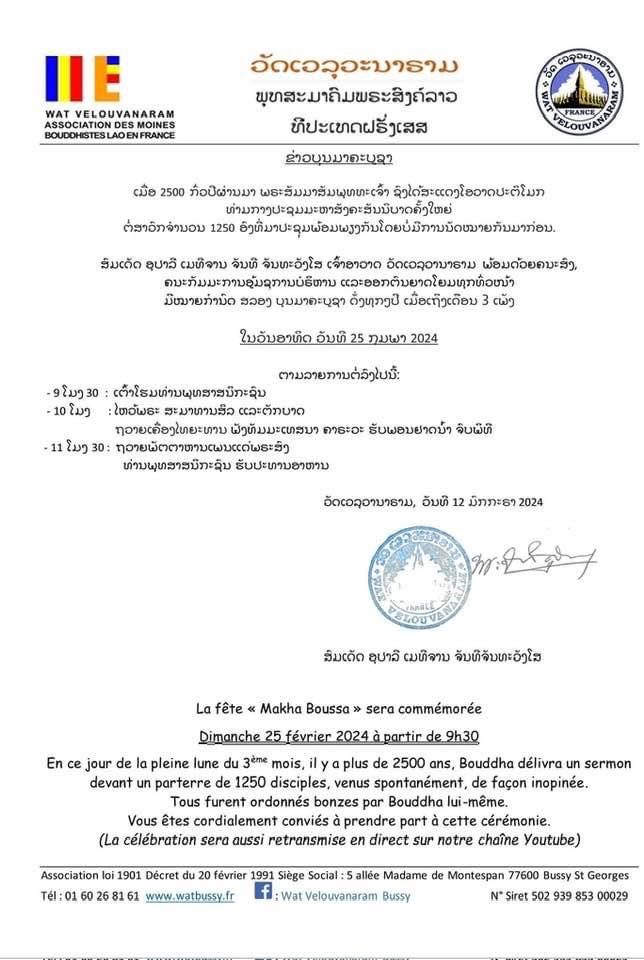 “ບຸນມາຄະບູຊາ ທີ່ວັດເວລຸວະນາຣາມ ເມືອງບຸດຊີແຊງຊອກ ເຂດ ໗໗ ຊານນະຄອນຫຼວງປາຣີສ ປະເທດຝຣັ່ງເສດ ໃນວັນອາທີດ ທີ ໒໕ ກູມພາ ໒໐໒໔ “ 25/01/2024 Lao Info ສັງຄົມ - SOCIETY