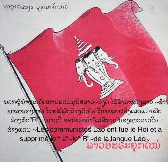 ພວກຜູ້ນຳຜະເດັດການຄອມມຸນີສລາວ~ວຽດ ໄດ້ຂ້າຣາຊວົງລາວ ~ຂ້າພາສາຂອງຊາດ ໂດຍໄດ້ລືບລ້າງຕົວ”ຣ”ໃນພາສາຝຣັ່ງເສດແມ່ນ ລືບລ້າງຕົວ”R”ມາບາດນີ້ ຈະນຳມາຂ້າ”ເສຣີພາບ”ຂອງຊາວລາວໃນຕ່າງແດນ~Les communiste Lao ont tue le Roi et a supprimé le “ ຣ”~le” R”~de la langue Lao et maintenant ils veulent enlever la liberté des lao à l’étranger.
