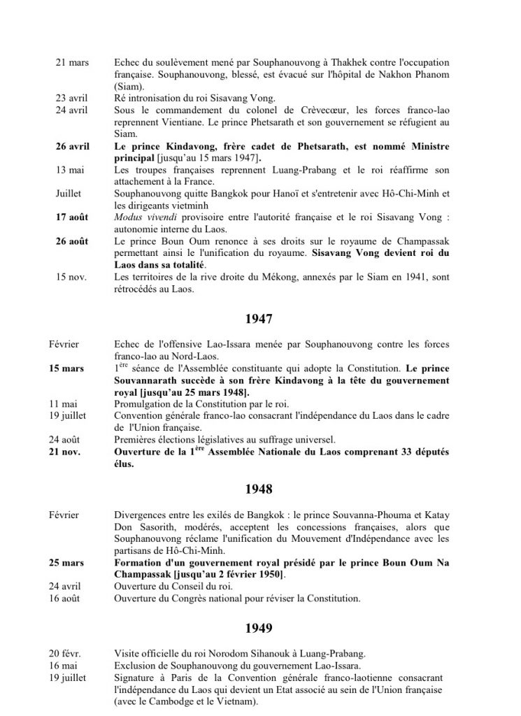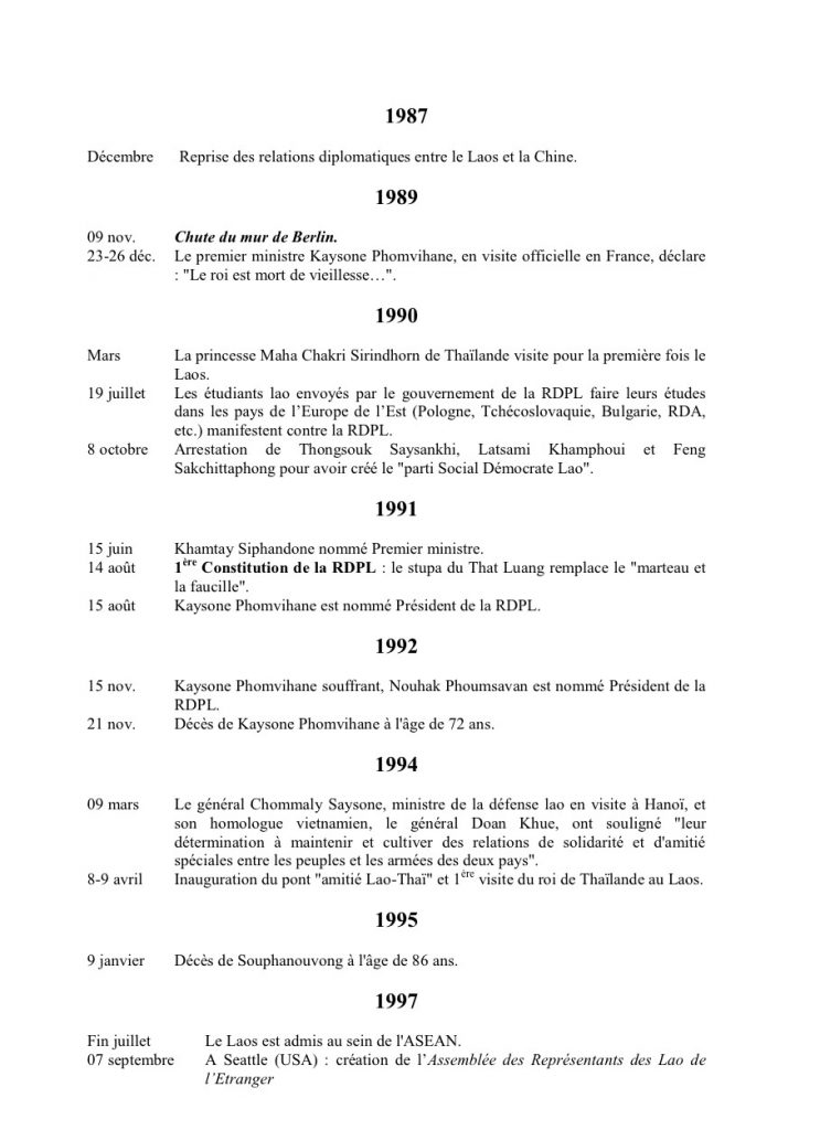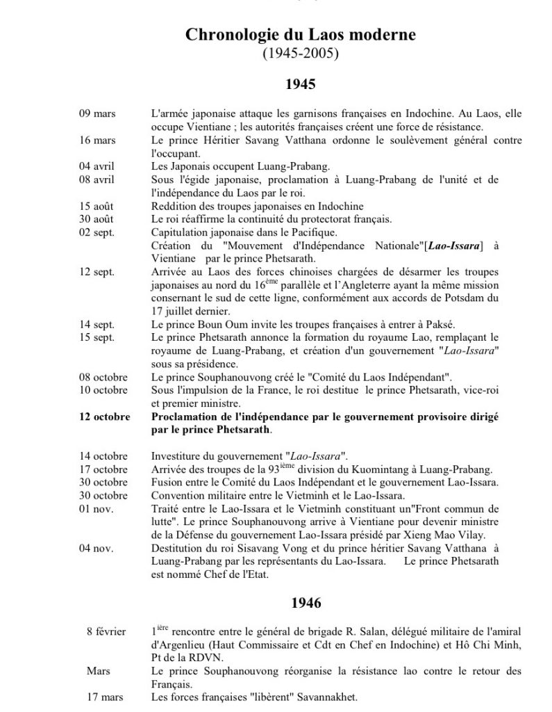ສ້າງຕັ້ງຂຶ້ນໃນປີ ໑໓໕໓, ອານາຈັກລ້ານຊ້າງໄດ້ກາຍເປັນຣັດເອກະຣາດໃນປີ ໑໙໔໙ ໂດຍສະຫະພາບຝຣັ່ງເສດ. ໃນສົງຄາມອິນດູຈີນ, ຄນະແນວລາວ ໄດ້ຜູກພັນກັບໂຮຈິມິນ. ລາວຕົກຢູ່ໃນກ້ຽວວຽນຂອງສົງຄາມຫວຽດນາມ. ຣະບອບຣາຊາທິປະໄຕ, ມີອາຍຸ ໗ ສັຕະວັດ, ຖືກຍົກເລີກ ແລະປ່ຽນແທນດ້ວຍ “ປະຊາທິປະໄຕຣວມສູນ” ໃນຣະບອບຄອມມູນິສຫວຽດນາມ. ເຈົ້າສຸວັນນະພູມາ, ຫລານຊາຍຂອງກະສັດລາວອົງສຸດທ້າຍ, ພະຍານສິດທິພິເສດ, ໄດ້ນໍາເອົາອົງປະກອບຂອງຄວາມຮູ້ປະຫວັດສາດຂອງລາວ.