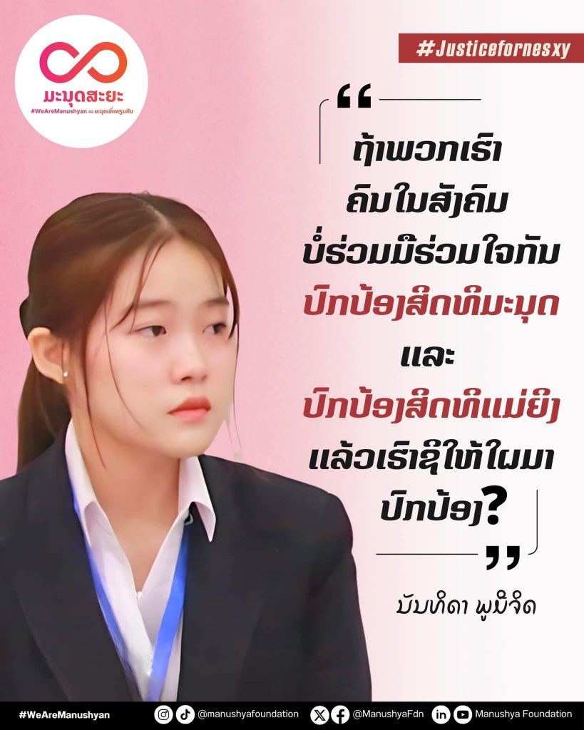 “ຖ້າພວກເຮົາຄົນໃນສັງຄົມ ບໍ່ຮ່ວມມືຮ່ວມໃຈກັນ ປົກປ້ອງສິດທິມະນຸດ ແລະປົກປ້ອງສິດທິແມ່ຍິງ ແລ້ວເຮົາຊິໃຫ້ໃຜມາປົກປ້ອງ? Nesxy Nanthida “~ ຂ່າວຈາກມຸນິທິມະນຸດສະຍະ~Manushya Lao 18/06/2024 Lao Info ສັງຄົມ - SOCIETY https://www.facebook.com/61557965518320/posts/pfbid026RuBTaEPhtviZEx2wf3fTnZJnxNAcFjxttRZ2g8a8pgspukmAmjC3oTK7h58tCPhl/