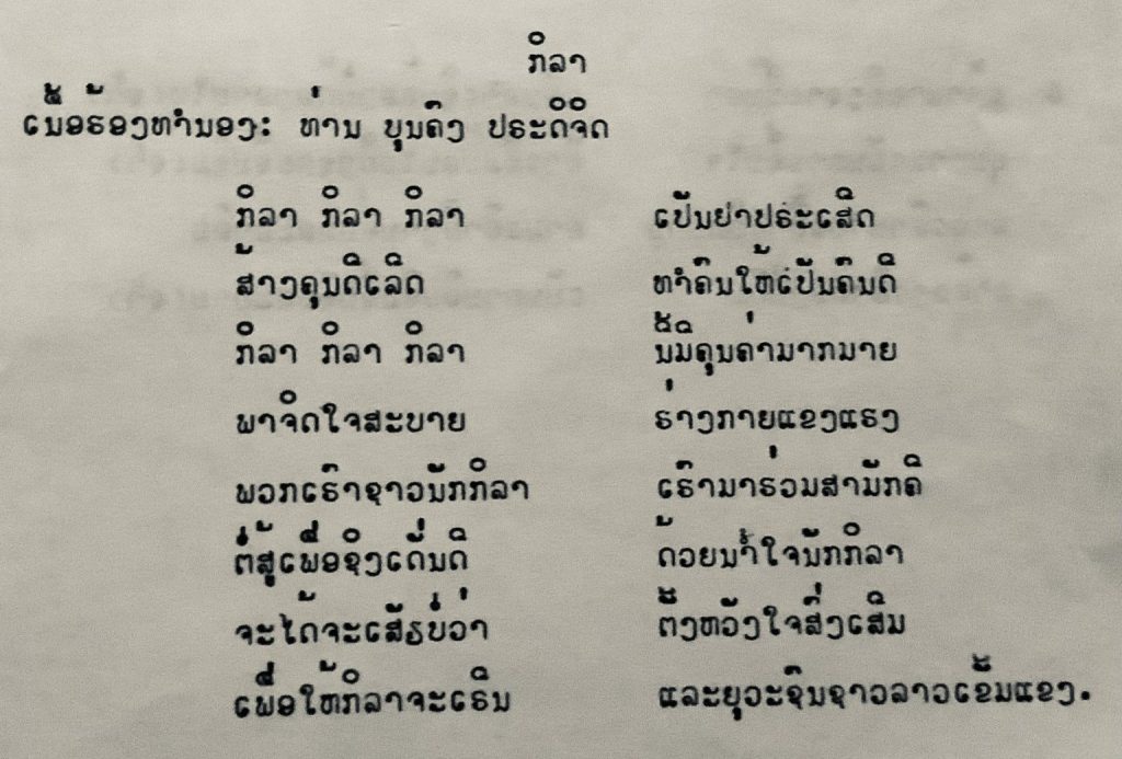 ເພັງ”ກິລາລາວ”~ເນື້ອຮ້ອງ ແລະທຳນອງ ໂດຍທ່ານບຸນຄົງ ປຣະດີຈີດ~ດົນຕຮີ ສ້າງຂື້ນໃໝ່ ໂດຍແກ້ວນຸວົງ ຊໍ່ຊນະວົງສາ ຮ້ອງໂດຍຄຳສະໄຫວ ສານຸວົງ
