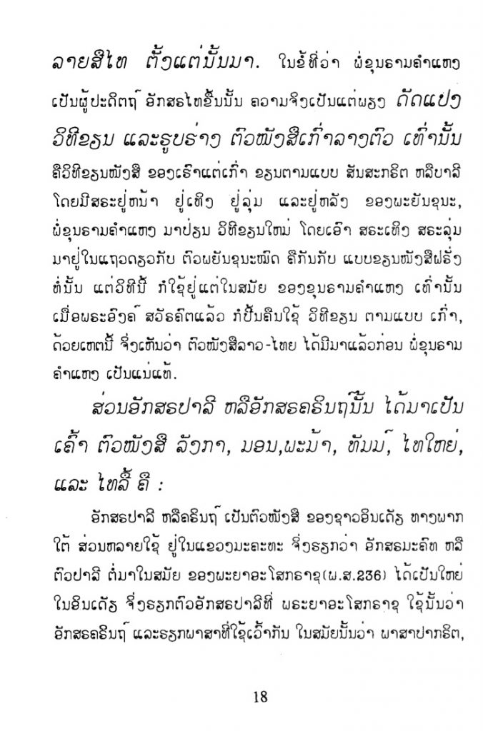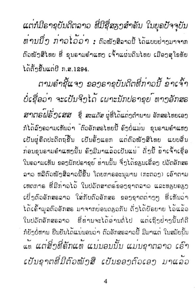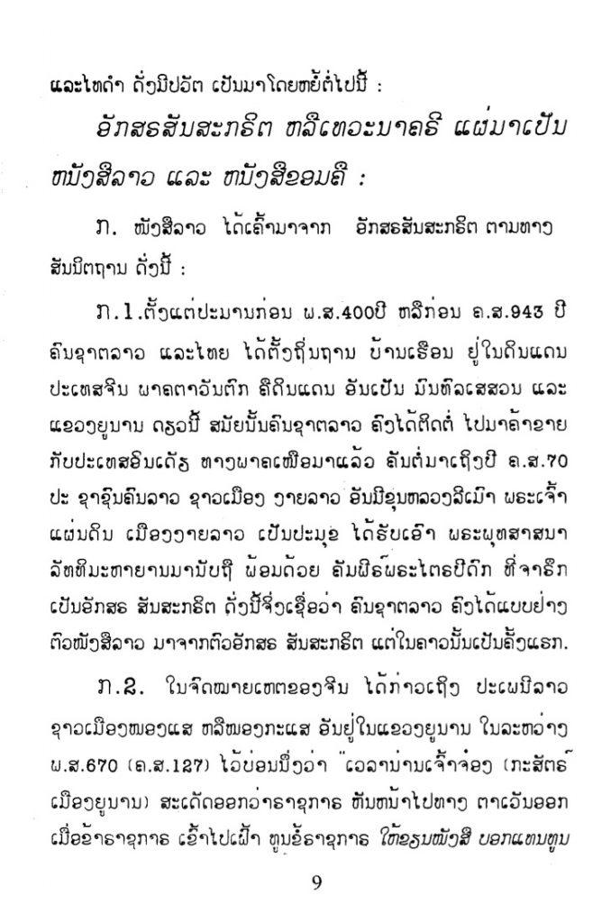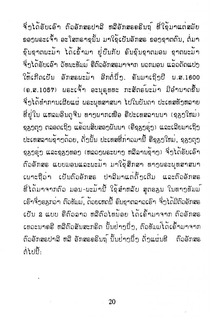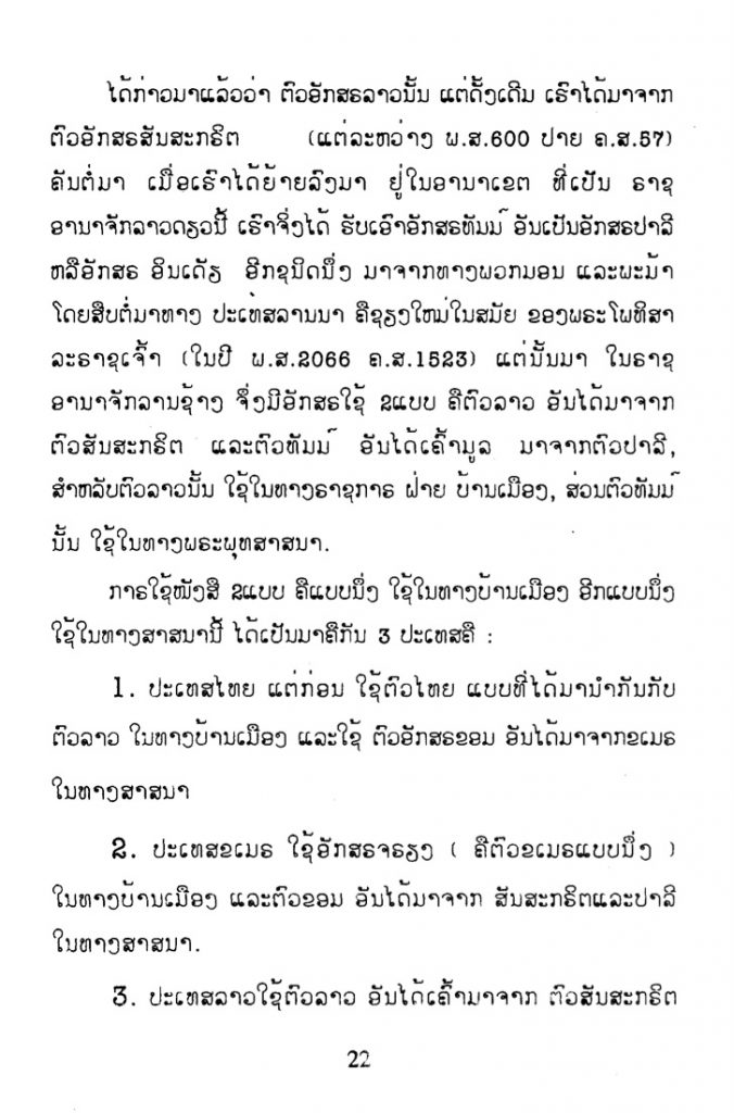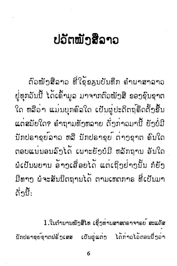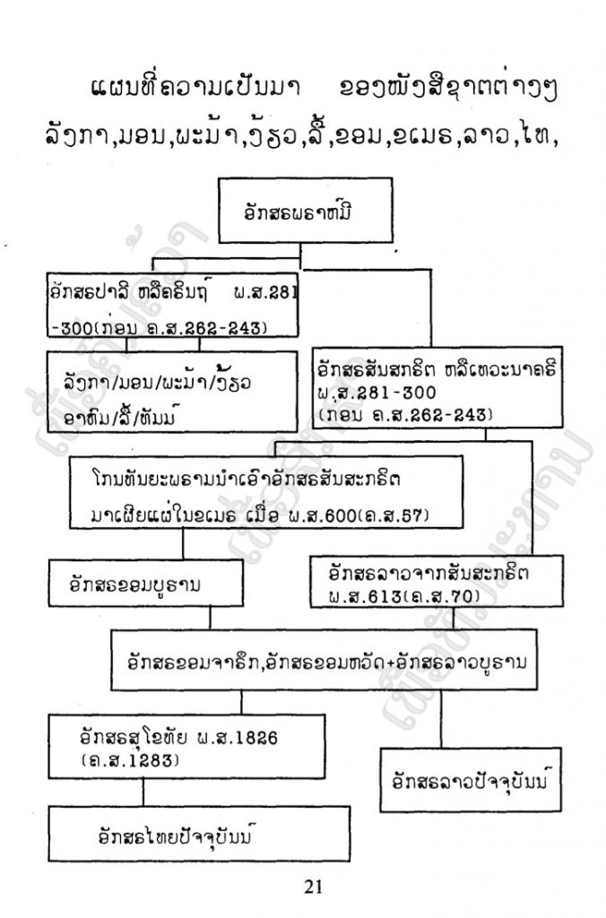 ນັກວິຊາການລາວບາງທ່ານໄດ້ຕັ້ງຂໍ້ສັນນິຖານຈາກຫລັກຖານທີ່ມີວ່າໂຕໜັງສືລາວເດີມ ແມ່ນເລີ່ມມີພັດທະນາການຈາກໂຕອັກສອນເທວະນາຄຣີ ກາຍມາເປັນໂຕອັກສອນລາວເດີມ ປະມານ ລະຫວ່າງປີ ພ.ສ 570-620 ເຊິ່ງກົງກັບສະໄໝອານາຈັກອ້າຍລາວ ທີ່ໄດ້ຕັ້ງຖິ່ນຖານກັນຢູ່ແຖວລຸ່ມນໍ້າຢັງຊີກຽງ ແລະ ຮວງໂຫ ທາງຕອນກາງ ແລະ ຕອນໃຕ້ ຂອງປະເທດຈີນໃນປັດຈຸບັນ ເຊິ່ງມີນະຄອນເພງາຍເປັນເມືອງຫຼວງ ເເລະເປັນຍຸກດຽວກັນກັບການເຂົ້າມາຂອງສາສະໜາພຸດນິກາຍມະຫາຍານຈາກອິນເດັຍເໜືອ.