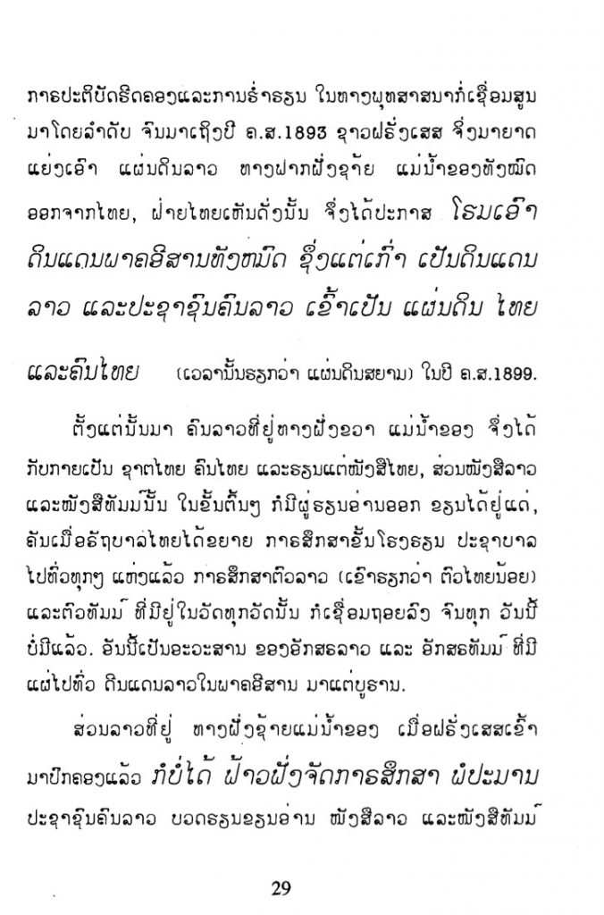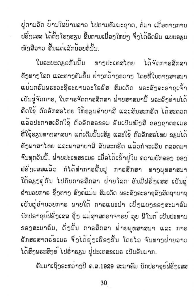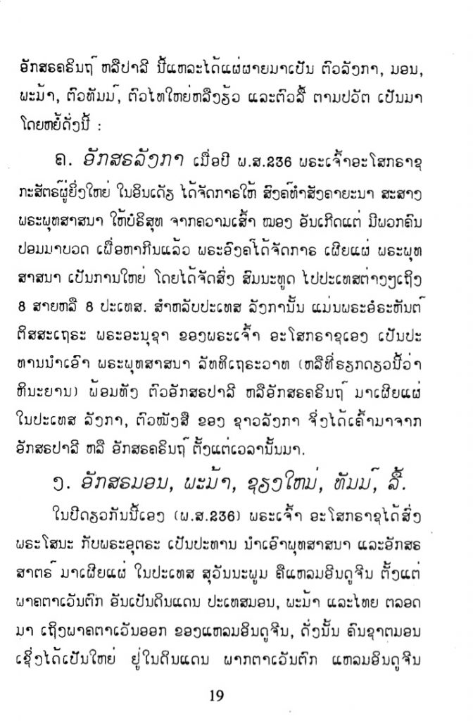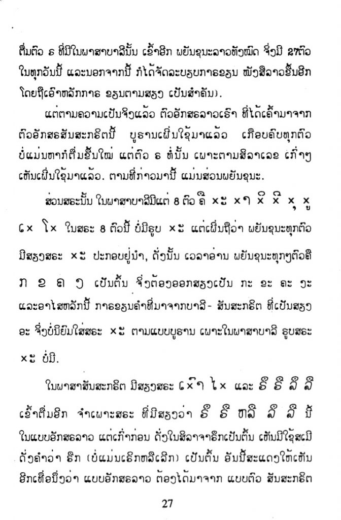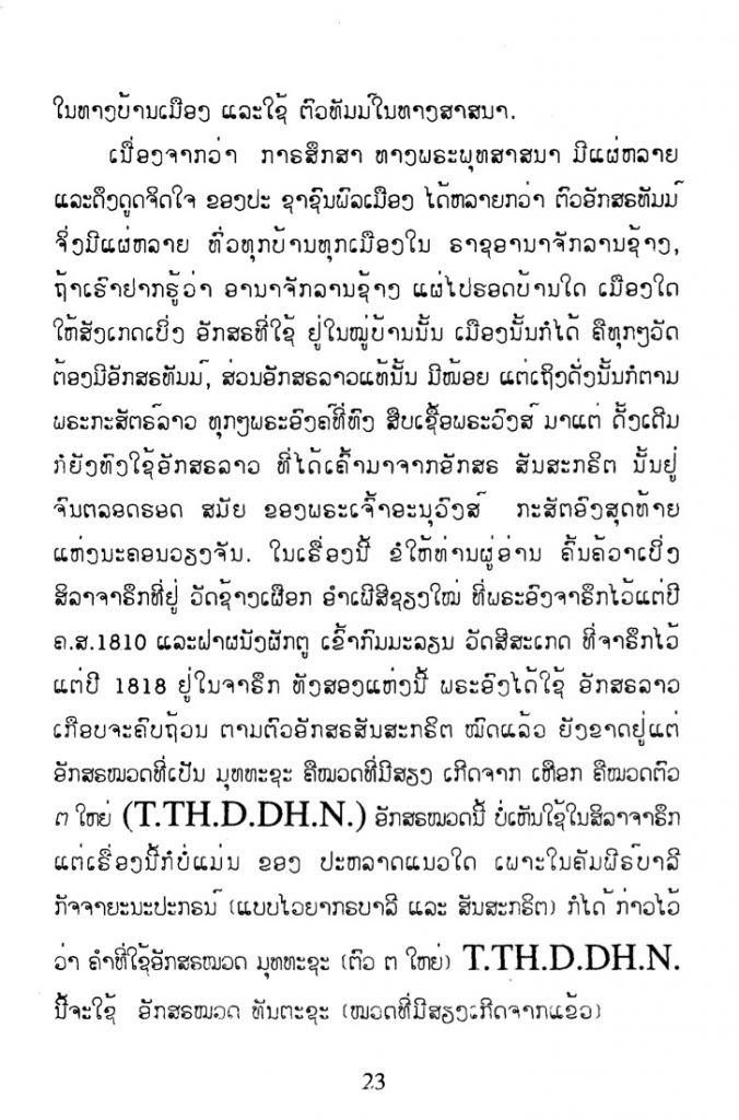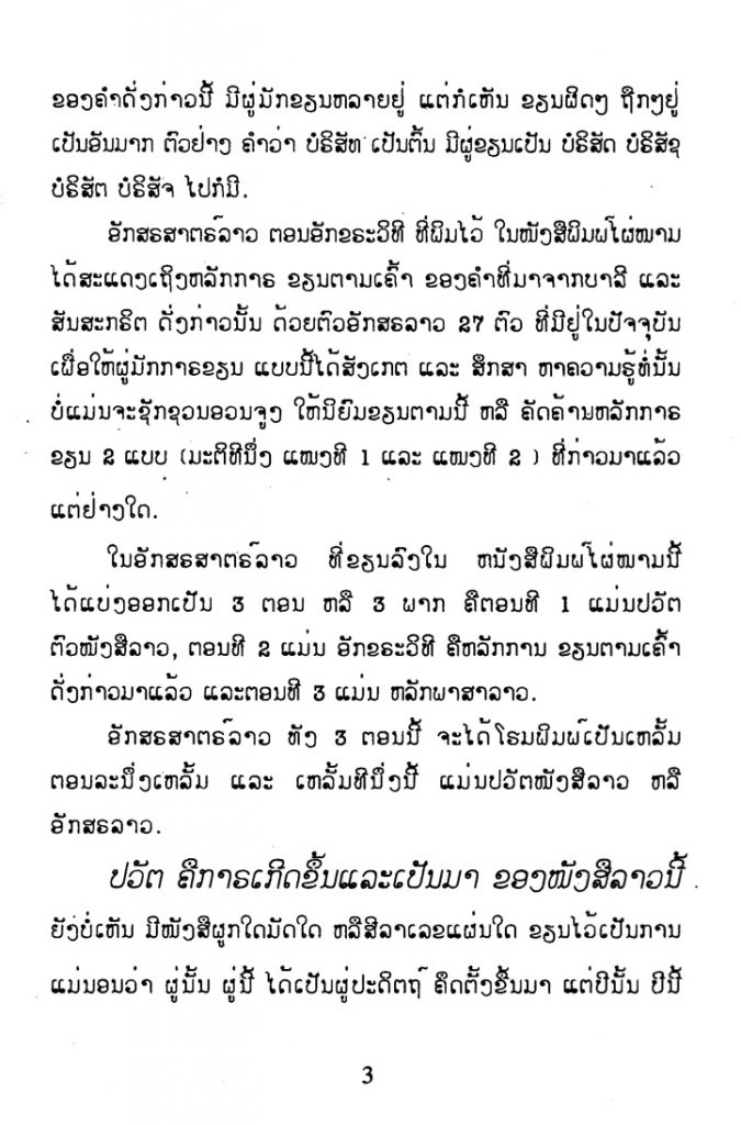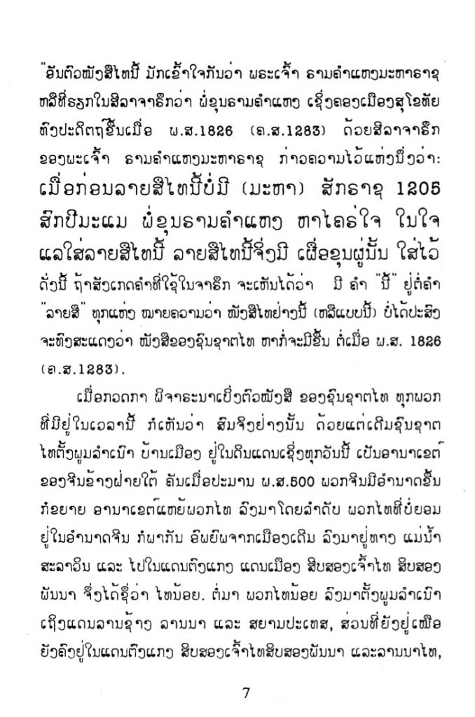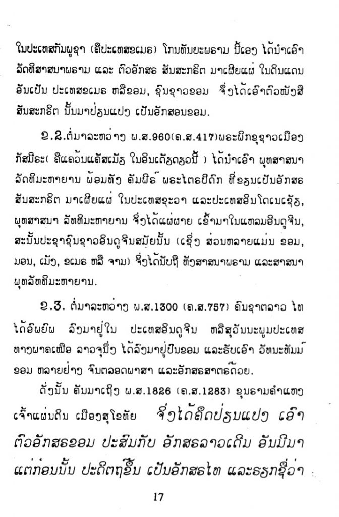 ນັກວິຊາການລາວບາງທ່ານໄດ້ຕັ້ງຂໍ້ສັນນິຖານຈາກຫລັກຖານທີ່ມີວ່າໂຕໜັງສືລາວເດີມ ແມ່ນເລີ່ມມີພັດທະນາການຈາກໂຕອັກສອນເທວະນາຄຣີ ກາຍມາເປັນໂຕອັກສອນລາວເດີມ ປະມານ ລະຫວ່າງປີ ພ.ສ 570-620 ເຊິ່ງກົງກັບສະໄໝອານາຈັກອ້າຍລາວ ທີ່ໄດ້ຕັ້ງຖິ່ນຖານກັນຢູ່ແຖວລຸ່ມນໍ້າຢັງຊີກຽງ ແລະ ຮວງໂຫ ທາງຕອນກາງ ແລະ ຕອນໃຕ້ ຂອງປະເທດຈີນໃນປັດຈຸບັນ ເຊິ່ງມີນະຄອນເພງາຍເປັນເມືອງຫຼວງ ເເລະເປັນຍຸກດຽວກັນກັບການເຂົ້າມາຂອງສາສະໜາພຸດນິກາຍມະຫາຍານຈາກອິນເດັຍເໜືອ.