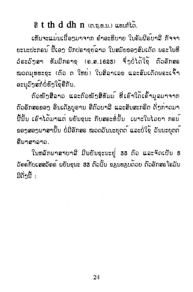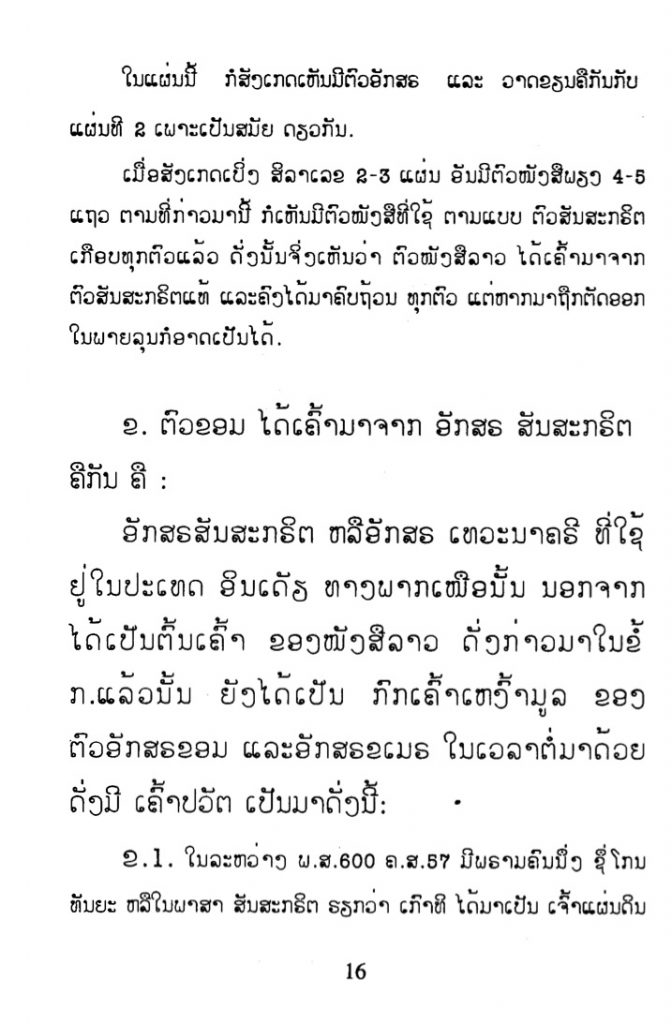 ນັກວິຊາການລາວບາງທ່ານໄດ້ຕັ້ງຂໍ້ສັນນິຖານຈາກຫລັກຖານທີ່ມີວ່າໂຕໜັງສືລາວເດີມ ແມ່ນເລີ່ມມີພັດທະນາການຈາກໂຕອັກສອນເທວະນາຄຣີ ກາຍມາເປັນໂຕອັກສອນລາວເດີມ ປະມານ ລະຫວ່າງປີ ພ.ສ 570-620 ເຊິ່ງກົງກັບສະໄໝອານາຈັກອ້າຍລາວ ທີ່ໄດ້ຕັ້ງຖິ່ນຖານກັນຢູ່ແຖວລຸ່ມນໍ້າຢັງຊີກຽງ ແລະ ຮວງໂຫ ທາງຕອນກາງ ແລະ ຕອນໃຕ້ ຂອງປະເທດຈີນໃນປັດຈຸບັນ ເຊິ່ງມີນະຄອນເພງາຍເປັນເມືອງຫຼວງ ເເລະເປັນຍຸກດຽວກັນກັບການເຂົ້າມາຂອງສາສະໜາພຸດນິກາຍມະຫາຍານຈາກອິນເດັຍເໜືອ.ນອກຈາກນີ້ທ່ານມະຫາສິລາ ວີຣະວົງ ນັກພາສາສາດລາວ ເຄີຍໄດ້ໃຫ້ຄວາມເຫັນໄວ້ວ່າ “ຈາກການອ້າງອີງຕຳນານໜອງແສ ແລະ ການປຽບທຽບໂຕໜັງສືບູຮານຕ່າງໆນັ້ນ ໜັງສືລາວທີ່ພວກເຮົາໃຊ້ໃນທຸກມື້ນີ້ແມ່ນໄດ້ຮັບອິດທິພົນມາຈາກ ໂຕໜັງສືສັນສະກິດ ແລະ ໄດ້ຖືກນຳໃຊ້ໃນແຫຼມສຸວັນນະພູມ ຫຼື ແຫຼມອິນດູຈີນທາງຕອນເໜືອມາເປັນເວລາພັນກວ່າປີ ແລ້ວ.” (ຄັດຈາກ: ປະຫວັດຫນັງສືລາວ, ວຽງຈັນ, ສຳນັກພິມໄຜ່ໜາມ)