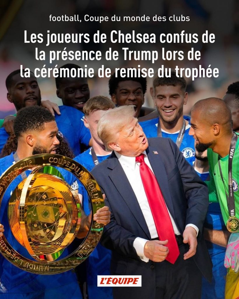 “ ເຕັມທີ່ໃນລະຫວ່າງການສະເຫຼີມສະຫຼອງ”ແຊນຊີ~ Chelsea) ໃນການແຂ່ງຂັນເຕະບານສໂມສອນໂລກ ໒໐໒໕ Club World Cup (3-0 ໃນຮອບຊີງຊນະເລີດ ຊນະ ເປແອສເຊ ໓ຕໍ່໐ ໃນວັນອາທິດ ໑໓ ກໍຣະກະດາ, Donald Trump ໄດ້ເຊື້ອເຊີນຕົວເອງໄປສູ່ເວທີທີ່ Reece James ຍົກຣາງວັນໃຫ້ “ແຊນຊີ(Blues)~ຂ່າວຈາກໜັງສືພີມກິລາ”ເລກີບເປີ~l’équipe