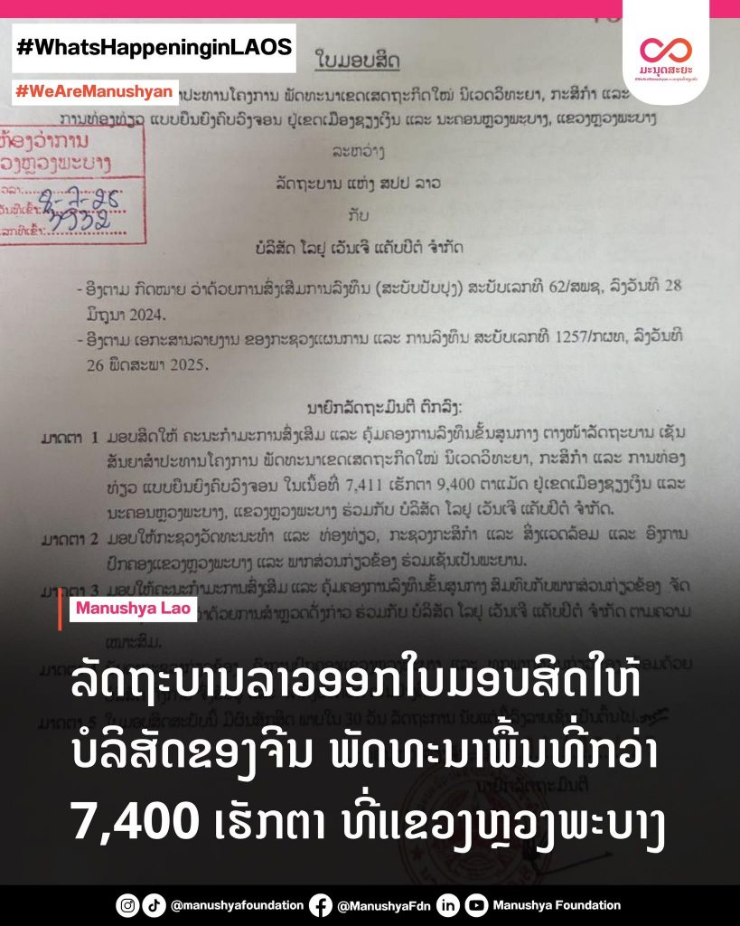ນາຍົກລັດຖະມົນຕີ ສອນໄຊ ສີພັນດອນ ໄດ້ອອກ “ໃບມອບສິດ” ອະນຸຍາດໃຫ້ບໍລິສັດ ໂລຢູ່ ເວັນເຈີ ແຄັບປິຕໍ ຈຳກັດ (Ruoyu Venture Capital) ເຂົ້າເຮັດສັນຍາສໍາປະທານເພື່ອພັດທະນາເຂດເສດຖະກິດໃໝ່ ນິເວດວິທະຍາ, ກະສິກຳ ແລະ ການທ່ອງທ່ຽວແບບຍືນຍົງຄົບວົງຈອນ ກວມເອົາພື້ນທີ່ 7,411 ເຮັກຕາ ຢູ່ເຂດເມືອງຊຽງເງິນ ແລະ ນະຄອນຫຼວງພະບາງ, ແຂວງຫຼວງພະບາງ ໃນວັນທີ ໔ ກໍຣະກະດາ ໒໐໒໕ ~ຂ່າວຈາກມຸນິທິມະນຸດສະຍະ~Manushya Lao