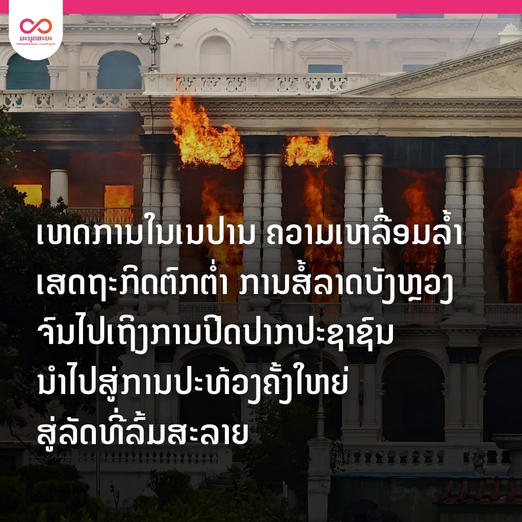 ເຫດການ ໃນປະເທດເນປານໃນເດືອນກັນຍາ ໒໐໒໕ ບໍ່ໄດ້ເກີດຂຶ້ນພຽງເພາະ “ໂຊຊຽວມີເດັຍຖືກປິດ” ແຕ່ແທ້ຈິງແລ້ວມັນເປັນລະເບີດຄວາມຄຽດແຄ້ນທີ່ສະສົມມາດົນ ໂດຍສະເພາະເຈນຊີ (Gen Z) ໄດ້ຕັດສິນໃຈອອກມາຢູ່ເທິງຖະນົນ.~ຂ່າວຈາກມຸນິທິມະນຸດສະຍະ~Manushya Lao 10/09/2025 Lao Info ການເມືອງ - POLITIC, ຂ່າວ - NEWS, ສັງຄົມ - SOCIETY https://www.facebook.com/61557965518320/posts/pfbid02fiYuVoKpzcd2V9i8d2NaM4xhWFPBecyA8X7kgxvWzpNqy7vqnS5JcvpWzex1z2zUl/