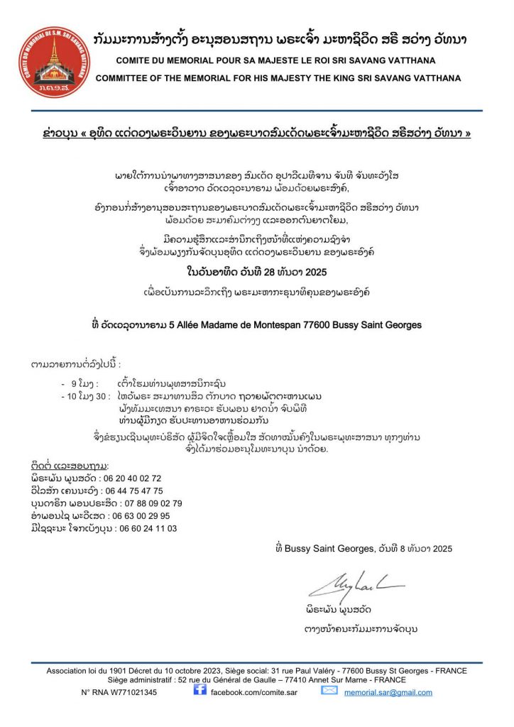 ຂ່າວບຸນອຸທີດແດ່ດວງພຣະວີນຍານຂອງພຣະບາດສົມເດັດພຣະເຈົ້າມະຫາຊິວີດ ສຣີສວ່າງ ວັທນາ ໃນວັນອາທີດ ວັນທີ ໒໘ ທັນວາ ໒໐໒໕ ທີ່ວັດເວລຸວະນາຣາມແຫ່ງເມືອງບຸດຊີ ແຊງຊອກ ເຂດ ໗໗ ຊານນະຄອນຫຼວງປາຣີສ ປະເທດຝຣັ່ງເສດ