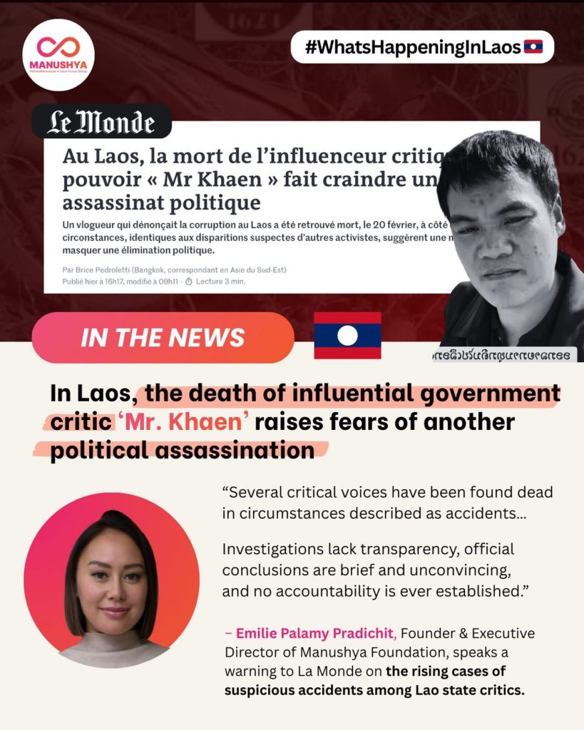 “ໃນສປປລາວ : ການເສັຍຊີວີດຂອງນັກວິຈານຣັຖບານ ທີມີອິດທິພົນ ທ່ານ”ໝໍແຄນ(Khaen)~ຂ່າວຈາກມຸນິທິມ ະນຸດສະຍະ~Manushya Foundation