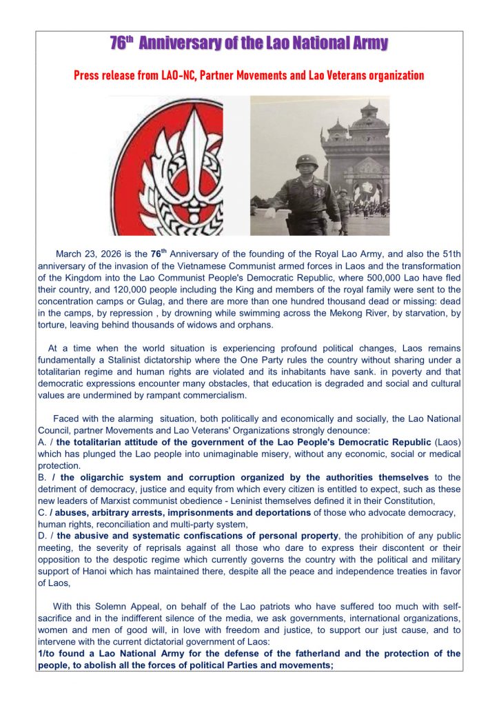 ຖແລງການຂອງ”ສະພາຮ່ວມຊາດລາວແລະອົງການພາຄີ” ເນື່ອງໃນໂອກາດວັນຄົບຮອບ”76ປີ”ວັນກຳເນີດຂອງກອງທັບແຫ່ງພຣະຣາຊອານາຈັກລາວ ວັນທີ 23 ມີນາ 1950~23 ມີນາ 2026 : 23/03/2026 Lao Info ການເມືອງ - POLITIC, ຂ່າວ - NEWS, ສັງຄົມ - SOCIETY
